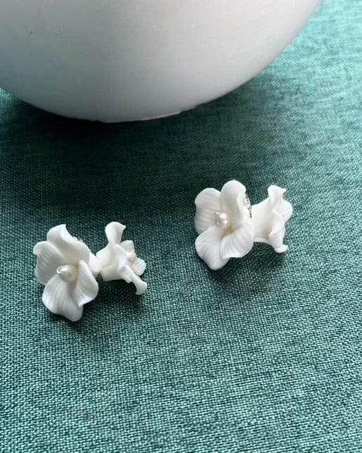 Porcelain White Flower Bridal Earrings with Freshwater Pearls, Wedding Earrings for Brides, Boho Floral Earrings, Bridal Party Accessories